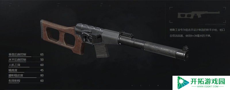 VSS采用半自动和全自动两种击发模式,配备转拴式枪栓和长行程气动式活塞系统。这把武器的初始弹匣容量为10发,使用9x39mm口径弹药,枪口初速达到287米/秒,理论射速高达850发/分钟。整枪重量为6.22公斤,在暗区突围中可以通过局内搜寻、市场购买、击败高级游荡者或联络人兑换等方式获取。